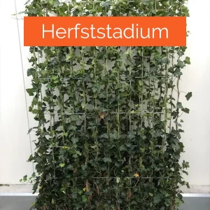 Hedera of klimop is een plant die via bomen en andere klimsteunen naar het licht toe groeit. Bij onze kant en klaar haag is deze klimsteun een ijzeren frame waar de plant haar hechtwortels makkelijk aan kunnen groeien. De hedera is van oorsprong een bosplant, hierdoor kan de plant goed tegen schaduw. Het is een snelle groeier, waardoor het per jaar wel zo’n 100 cm aan kan groeien. Ook blijft de plant het hele jaar mooi groen.